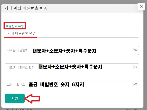 비밀번호 유형을 꼭 ‘거래 비밀번호 변경’ 으로 선택하세요