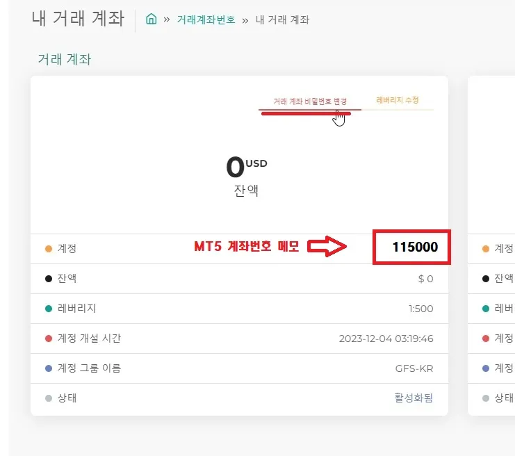 ● 계정에 적혀있는 MT5 계좌번호를 별도로 메모 합니다