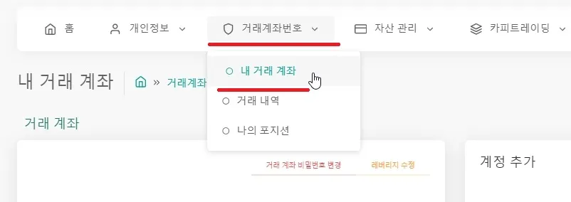 ● 실계좌 개설을 위해 [거래계좌번호] → [내 거래 계좌] 메뉴로 이동합니다.