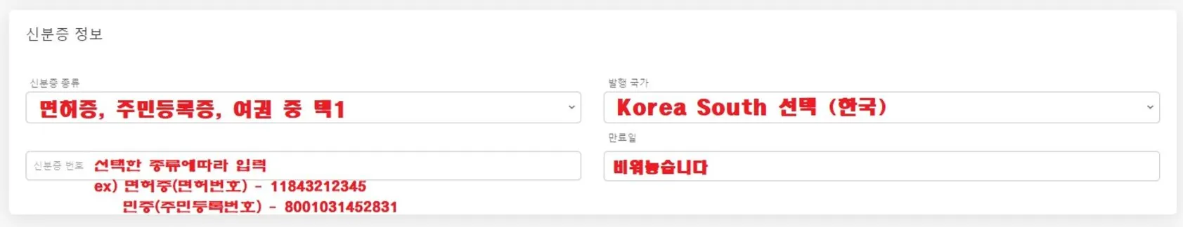 ● 신분증 번호 입력시 특수문자는 제외후 입력합니다.